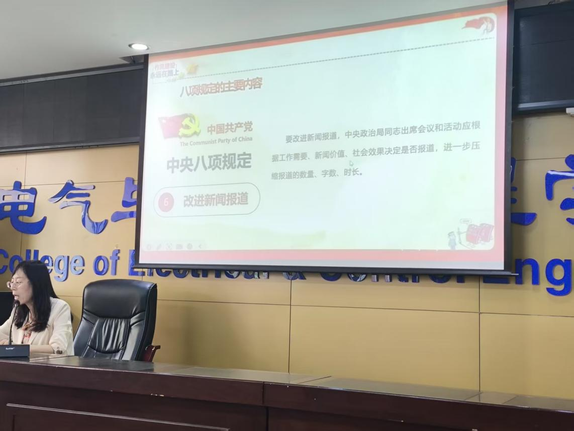 为深入学习贯彻2025年全国两会精神,推进深入贯彻中央八项规定精神学习教育走深走实,5月14日下午,电控学院举办2025年全国两会精神与中央八项规定精神宣讲报告会,邀请必赢官网马克思主义学院周静教授作专题辅导。报告会由学院党委书记杨华主持,学院全体教职工参加了学习。
