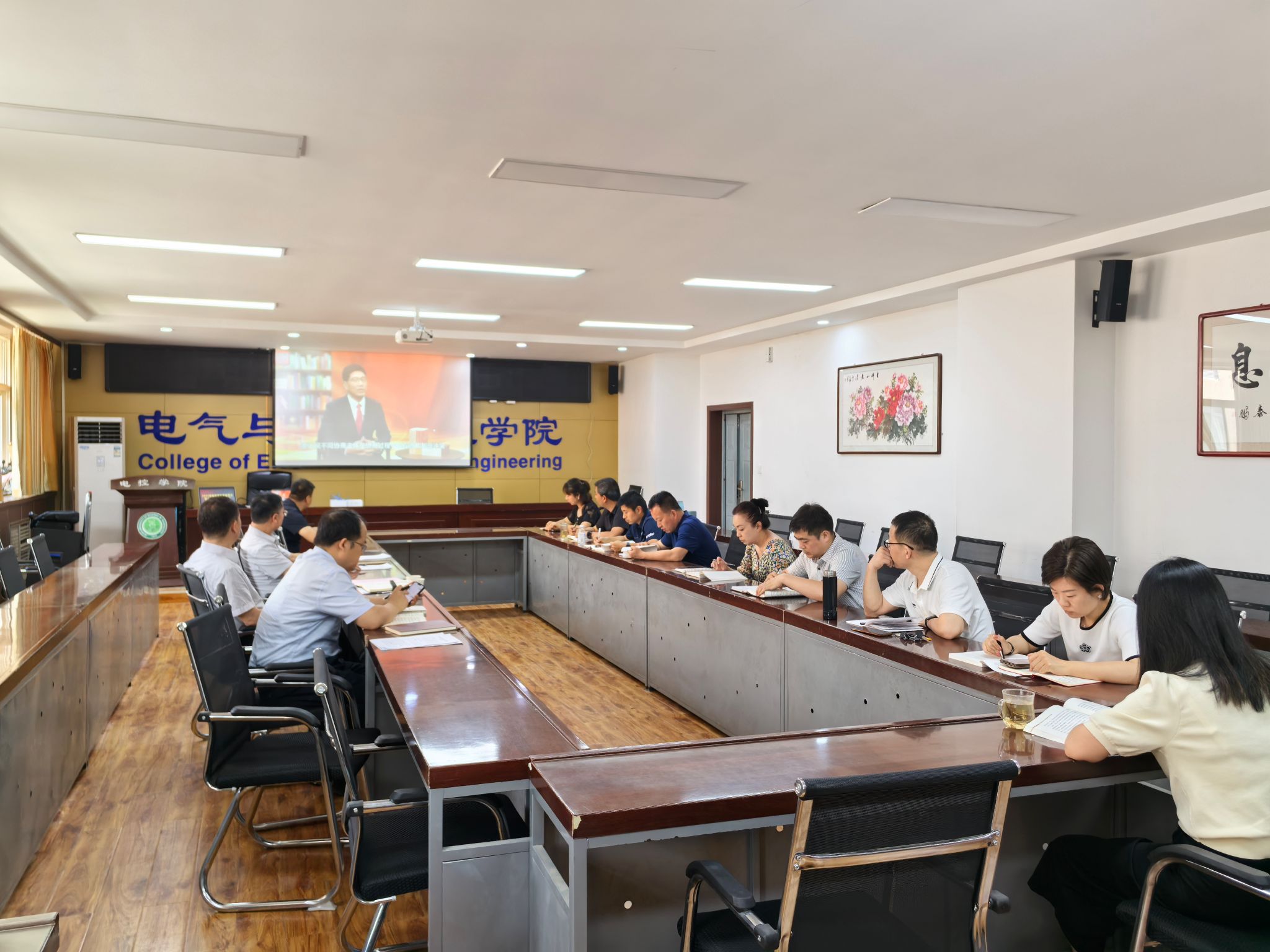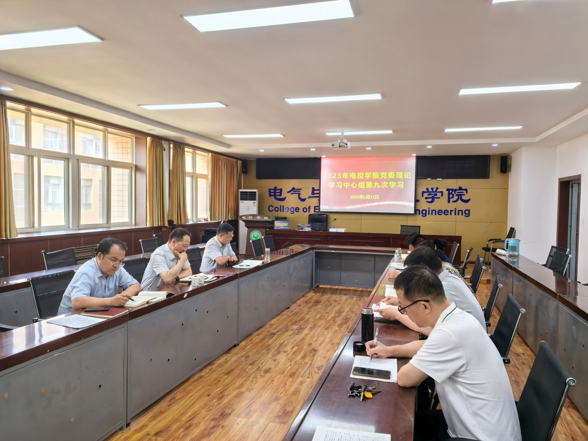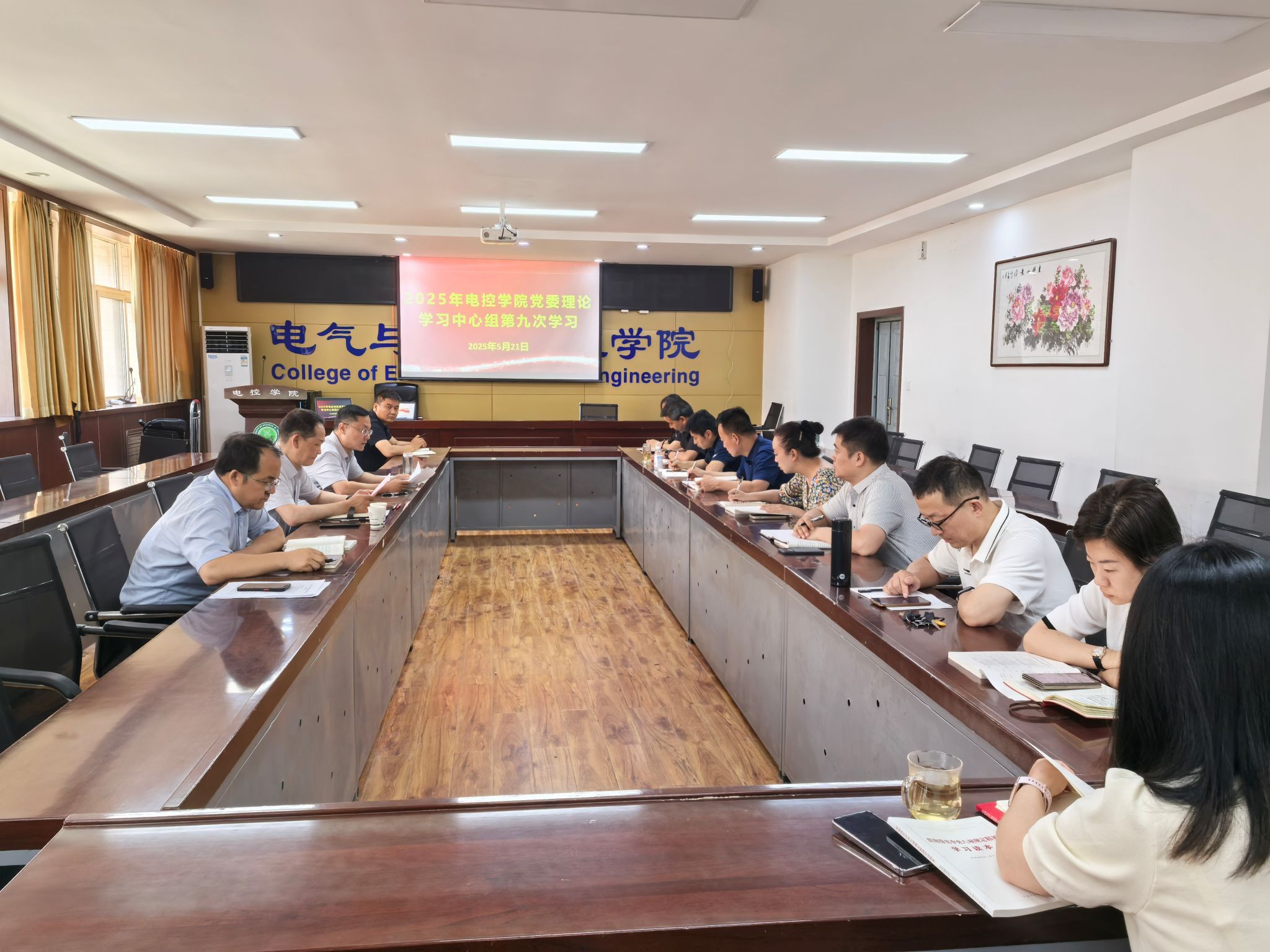 5月21日下午,电控学院党委理论学习中心组在临潼校区17-318会议室开展2025年第9次学习。副校长曹明到会指导,学院班子成员、党委委员、科级干部、工会主席等中心组成员参加学习。会议由电控学院党委负责人主持。