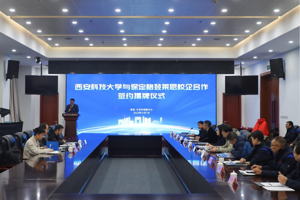 谷佳、寇发荣、李德辉分别致辞,围绕“共赢”核心传递合作愿景,并表示共建产学研合作基地,深化人才培养、技术研发、成果转化等多维度合作,实现高校、企业、区域发展的共赢。在与会嘉宾的见证下,保定格登莱恩与必赢76net线路官网双方代表签署了校企产学研合作协议,并共同为“必赢76net线路官网-保定格登莱恩电气设备制造有限公司产学研合作基地”揭牌。