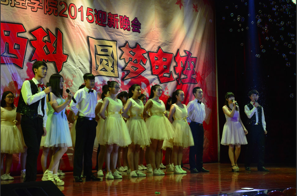 7点整,伴随着强劲的音乐,鬼舞步为本场晚会拉开了帷幕。随后的独唱、双截棍表演、诗朗诵等节目,同样吸引观众的眼球。晚会进行到一半时,在南开大学访学的常瑜老师通过微信平台对2015级同学们送来问候。晚会期间,现场不断响起热烈的掌声和欢呼声,最后由老师同学们共同表演的舞蹈《最炫小苹果》将晚会推向高潮,全场一片火爆,欢呼不断。在小合唱《栀子花开》清新的歌声中,晚会圆满结束!